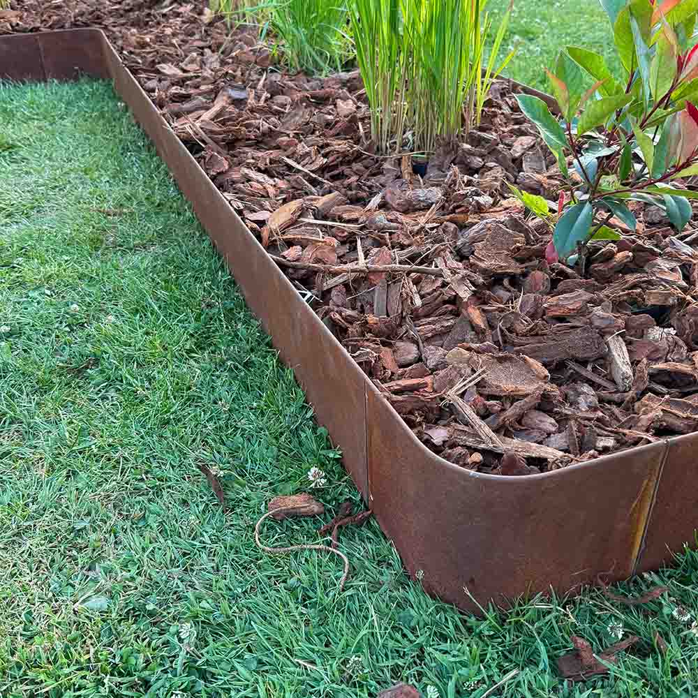 Kit de bordures en acier COR-TEN® – Modèle DELTA, longueur totale 49,3 m. Disponible en 4 hauteurs (10 à 30 cm). Bordures à double bord replié, avec pièces de raccordement fournies. Fixation facile et modulable grâce au système d'emboîtement et de piquet amovible.