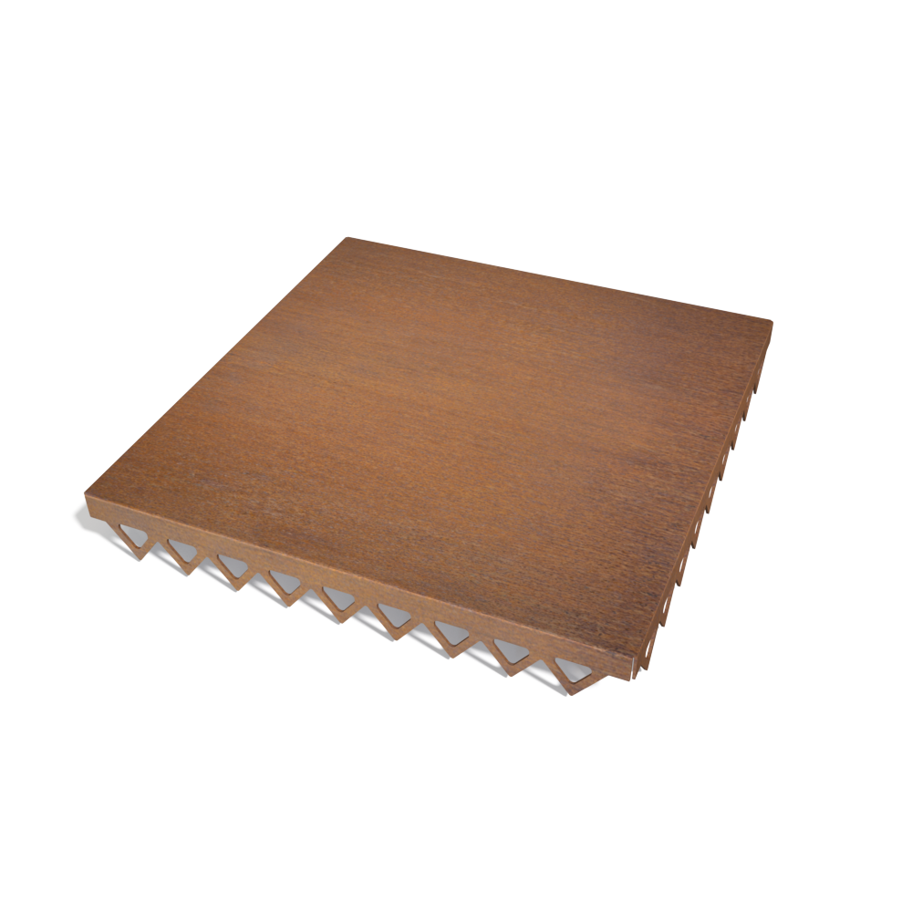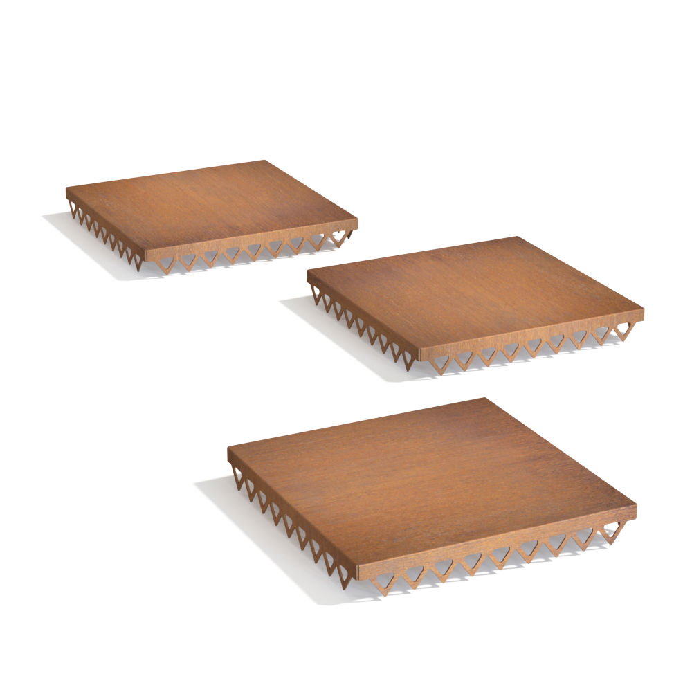 QUADRO est un pas japonais en acier Corten de forme carrée, renforcé par des plis latéraux et équipé de griffes pour un scellement solide dans le sol. Idéal pour créer un chemin structuré au style contemporain et naturel.